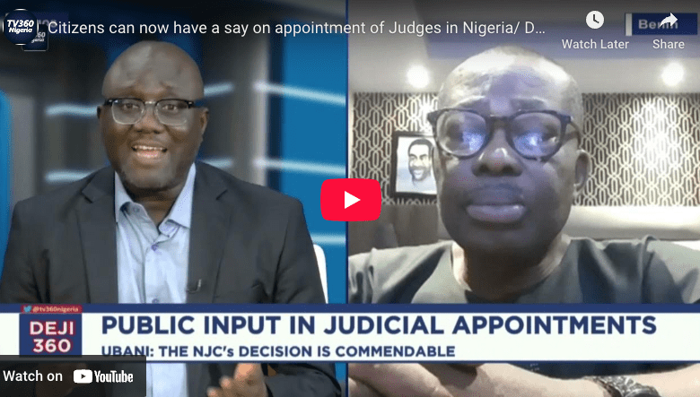 Home/Deji360/Citizens can now have a say on appointment of Judges in Nigeria/ DEJI 360 EP 541 PT 3: Deji360 Citizens can now have a say on appointment of Judges in Nigeria/ DEJI 360 EP 541 PT 3: Citizens can now have a say on appointment of Judges in Nigeria/ DEJI 360 EP 541 PT 3: TV360 NigeriaMay 21, 20250 46 Less than a minute Share this: TV360 NigeriaMay 21, 20250 46 Less than a minute Share Facebook X LinkedIn Tumblr Pinterest Reddit VKontakte Skype Messenger Messenger Share via Email Print